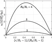 If R1 is the inner cylinder radii and R2 is the outer cylinder radii, with constant applied pressure gradient between the two ends G = −dp/dx, the velocity distribution and the volume flux through the annular pipe are