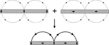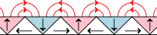 Although this magnetic flux distribution seems somewhat counter-intuitive to those familiar with simple bar magnets or solenoids, the reason for this flux distribution can be intuitively visualised using Mallinson's original diagram (note that it uses the negative y component, unlike the diagram in Mallinson's article). The diagram shows the field from a strip of ferromagnetic material with alternating magnetization in the y direction (top left) and in the x direction (top right). Note that the field above the plane is in the same direction for both structures, but the field below the plane is in opposite directions. The effect of superimposing both of these structures is shown in the figure.
