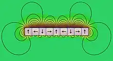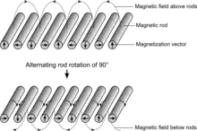 A series of magnetic rods, magnetized perpendicular to their axes, can be arranged into a Halbach array. If each rod is then rotated alternately through 90°, the resultant field moves from one side of plane of the rods to the other, as shown schematically in the figure.