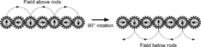 This arrangement allows the field to effectively be turned on and off above or below the plane of the rods, depending on the rotation of the rods. Such a device makes an efficient mechanical magnetic latch requiring no power. A detailed study of this arrangement has shown that each rod is subject to a strong torque from its neighboring rods, and therefore requires mechanical stabilization.[11] However, a simple and efficient solution, providing both stabilization and the ability to rotate each rod alternately, is simply to provide an equal-gearing arrangement on each rod, as shown in the figure.