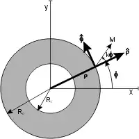 Because of the symmetry of the arrangement along the cylinder's axis, the problem can be treated as two-dimensional. Work in plane-polar coordinates with associated unit vectors and , and let the cylinder have radial extent . Then the magnetisation in the cylinder walls, which has magnitude , rotates smoothly as