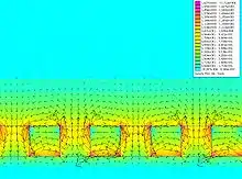 The magnetic field around an infinite Halbach array of cube magnets. The field does not cancel perfectly due to the discrete magnets used.
