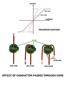 The range of a given feedthrough sensor may also be extended upward and downward by appropriate wiring. To extend the range to lower currents, multiple turns of the current-carrying wire may be made through the opening, each turn adding to the sensor output the same quantity; when the sensor is installed onto a printed circuit board, the turns can be carried out by a staple on the board. To extend the range to higher currents, a current divider may be used. The divider splits the current across two wires of differing widths and the thinner wire, carrying a smaller proportion of the total current, passes through the sensor.