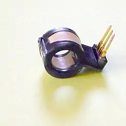 Integrating a Hall sensor into a ferrite ring (as shown) concentrates the flux density of the current's magnetic field along the ferrite ring and through the sensor (because flux flows through ferrite much better than through air),[25] which greatly reduces the relative influence of stray fields by a factor of 100 or better. This configuration also provides an improvement in signal-to-noise ratio and drift effects of over 20 times that of a bare Hall device.
