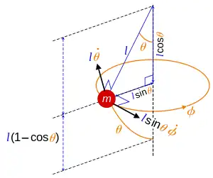 A spherical pendulum consists of a mass m moving without friction on the surface of a sphere. The only forces acting on the mass are the reaction from the sphere and gravity. Spherical coordinates are used to describe the position of the mass in terms of (r, θ, φ), where r is fixed, r = .