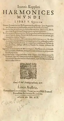 Harmonice Mundi (Harmonices mundi libri V)[1] (Latin: The Harmony of the World, 1619) is a book by Johannes Kepler. In the work, written entirely in Latin, Kepler discusses harmony and congruence in geometrical forms and physical phenomena. The final section of the work relates his discovery of the so-called third law of planetary motion.[2]