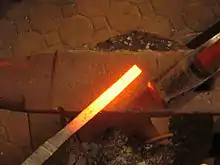 ![]() A glowing-hot metal bar showing incandescence, the emission of light due to its temperature, is often recognized as a source of heat | |