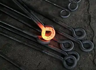 On a microscopic scale, heat conduction occurs as hot, rapidly moving or vibrating atoms and molecules interact with neighboring atoms and molecules, transferring some of their energy (heat) to these neighboring particles. In other words, heat is transferred by conduction when adjacent atoms vibrate against one another, or as electrons move from one atom to another. Conduction is the most significant means of heat transfer within a solid or between solid objects in thermal contact. Fluids—especially gases—are less conductive. Thermal contact conductance is the study of heat conduction between solid bodies in contact.[9] The process of heat transfer from one place to another place without the movement of particles is called conduction, such as when placing a hand on a cold glass of water—heat is conducted from the warm skin to the cold glass, but if the hand is held a few inches from the glass, little conduction would occur since air is a poor conductor of heat. Steady state conduction is an idealized model of conduction that happens when the temperature difference driving the conduction is constant, so that after a time, the spatial distribution of temperatures in the conducting object does not change any further (see Fourier's law).[10] In steady state conduction, the amount of heat entering a section is equal to amount of heat coming out, since the change in temperature (a measure of heat energy) is zero.[9] An example of steady state conduction is the heat flow through walls of a warm house on a cold day—inside the house is maintained at a high temperature and, outside, the temperature stays low, so the transfer of heat per unit time stays near a constant rate determined by the insulation in the wall and the spatial distribution of temperature in the walls will be approximately constant over time.