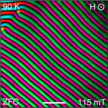 Helimagnetism was first proposed in 1959, as an explanation of the magnetic structure of manganese dioxide.[2] Initially applied to neutron diffraction, it has since been observed more directly by Lorentz electron microscopy.[4] Some helimagnetic structures are reported to be stable up to room temperature.[5] Like how ordinary ferromagnets have domain walls that separate individual magnetic domains, helimagnets have their own classes of domain walls which are characterized by topological charge.[6]