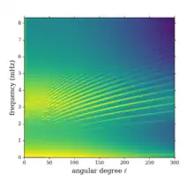 Surface gravity waves are analogous to waves in deep water, having the property that the Lagrangian pressure perturbation is essentially zero. They are of high degree , penetrating a characteristic distance , where is the solar radius. To good approximation, they obey the so-called deep-water-wave dispersion law: , irrespective of the stratification of the Sun, where is the angular frequency, is the surface gravity and is the horizontal wavenumber,[23] and tend asymptotically to that relation as .