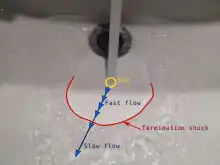 Other termination shocks can be seen in terrestrial systems; perhaps the easiest may be seen by simply running a water tap into a sink creating a hydraulic jump. Upon hitting the floor of the sink, the flowing water spreads out at a speed that is higher than the local wave speed, forming a disk of shallow, rapidly diverging flow (analogous to the tenuous, supersonic solar wind). Around the periphery of the disk, a shock front or wall of water forms; outside the shock front, the water moves slower than the local wave speed (analogous to the subsonic interstellar medium).