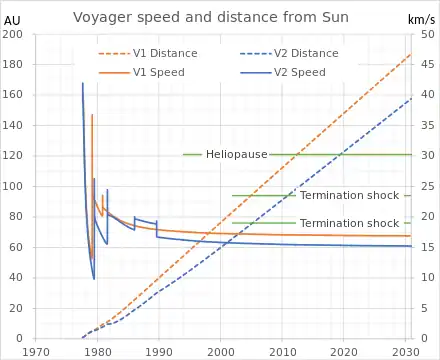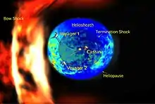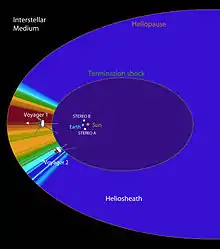The termination shock is the point in the heliosphere where the solar wind slows down to subsonic speed (relative to the Sun) because of interactions with the local interstellar medium. This causes compression, heating, and a change in the magnetic field. In the Solar System, the termination shock is believed to be 75 to 90 astronomical units[16] from the Sun. In 2004, Voyager 1 crossed the Sun's termination shock, followed by Voyager 2 in 2007.[3][5][17][18][19][20][21][22]