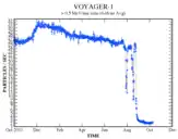 In May 2012, Voyager 1 detected a rapid increase in such cosmic rays (a 9% increase in a month, following a more gradual increase of 25% from January 2009 to January 2012), suggesting it was approaching the heliopause.[34] Between late August and early September 2012, Voyager 1 witnessed a sharp drop in protons from the Sun, from 25 particles per second in late August, to about 2 particles per second by early October.[35] In September 2013, NASA announced that Voyager 1 had crossed the heliopause as of 25 August 2012.[36] This was at a distance of 121 AU (1.81×1010 km) from the Sun.[37] Contrary to predictions, data from Voyager 1 indicates the magnetic field of the galaxy is aligned with the solar magnetic field.[38]