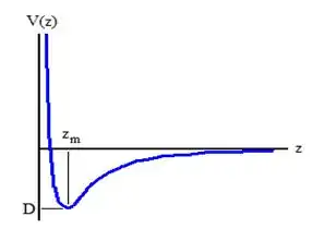 This potential can be broken down into an attractive portion due to Van der Waals forces, which dominates over large separation distances, and a steep repulsive force due to electrostatic repulsion of the positive nuclei, which dominates the short distances. To modify the potential for a two-dimensional surface, a function is added to describe the surface atomic corrugations of the sample. The resulting three-dimensional potential can be modeled as a corrugated Morse potential as:[3]