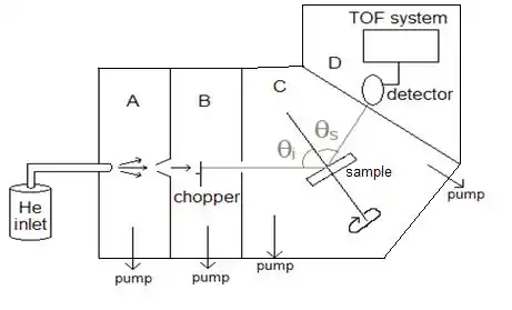 The accompanying figure is a general schematic of a helium atom scattering experimental setup. It consists of a nozzle beam source, an ultra high vacuum scattering chamber with a crystal manipulator, and a detector chamber. Every system can have a different particular arrangement and setup, but most will have this basic structure.