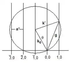 Here G is a reciprocal lattice vector, kG and ki are the final and initial (incident) wave vectors of the helium atom. The Ewald sphere construction will determine the diffracted beams to be seen and the scattering angles at which they will appear. A characteristic diffraction pattern will appear, determined by the periodicity of the surface, in a similar manner to that seen for Bragg scattering in electron and x-ray diffraction. Most helium atom scattering studies will scan the detector in a plane defined by the incoming atomic beam direction and the surface normal, reducing the Ewald sphere to a circle of radius R=k0 intersecting only reciprocal lattice rods that lie in the scattering plane as shown here: