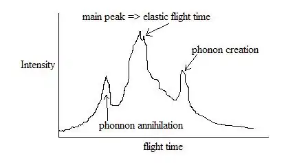 In order to study the inelastic scattering of the helium atom beam due only to single-phonon contributions, an energy analysis needs to be made of the scattered atoms. The most popular way to do this is through the use of time-of-flight (TOF) analysis. The TOF analysis requires the beam to be pulsed through the mechanical chopper, producing collimated beam 'packets' that have a 'time-of-flight' (TOF) to travel from the chopper to the detector. The beams that scatter inelastically will lose some energy in their encounter with the surface and therefore have a different velocity after scattering than they were incident with. The creation or annihilation of surface phonons can be measured, therefore, by the shifts in the energy of the scattered beam. By changing the scattering angles or incident beam energy, it is possible to sample inelastic scattering at different values of energy and momentum transfer, mapping out the dispersion relations for the surface modes. Analyzing the dispersion curves reveals sought-after information about the surface structure and bonding. A TOF analysis plot would show intensity peaks as a function of time. The main peak (with the highest intensity) is that for the unscattered helium beam 'packet'. A peak to the left is that for the annihilation of a phonon. If a phonon creation process occurred, it would appear as a peak to the right: