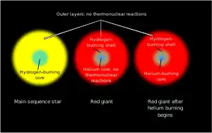During the red giant phase of stellar evolution in stars with less than 2.0 M☉ the nuclear fusion of hydrogen ceases in the core as it is depleted, leaving a helium-rich core. While fusion of hydrogen continues in the star's shell causing a continuation of the accumulation of helium in the core, making the core denser, the temperature still is unable to reach the level required for helium fusion, as happens in more massive stars. Thus the thermal pressure from fusion is no longer sufficient to counter the gravitational collapse and create the hydrostatic equilibrium found in most stars. This causes the star to start contracting and increasing in temperature until it eventually becomes compressed enough for the helium core to become degenerate matter. This degeneracy pressure is finally sufficient to stop further collapse of the most central material but the rest of the core continues to contract and the temperature continues to rise until it reaches a point (≈1×108 K) at which the helium can ignite and start to fuse.[4][5][6]