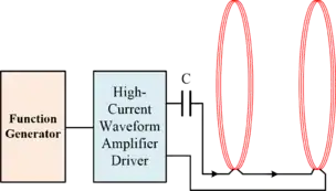 Generating a static magnetic field is relatively easy; the strength of the field is proportional to the current. Generating a high-frequency magnetic field is more challenging. The coils are inductors, and their impedance increases proportionally with frequency. To provide the same field intensity at twice the frequency requires twice the voltage across the coil. Instead of directly driving the coil with a high voltage, a series resonant circuit may be used to provide the high voltage.[7] A series capacitor is added in series with the coils. The capacitance is chosen to resonate the coil at the desired frequency. Only the coils parasitic resistance remains. This method only works at frequencies close to the resonant frequency; to generate the field at other frequencies requires different capacitors. The Helmholtz coil resonant frequency, , and capacitor value, C, are given below.[6]