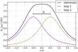 Setting , which is what defines a Helmholtz pair, minimizes the nonuniformity of the field at the center of the coils, in the sense of setting [2] (meaning that the first nonzero derivative is as explained below), but leaves about 7% variation in field strength between the center and the planes of the coils. A slightly larger value of reduces the difference in field between the center and the planes of the coils, at the expense of worsening the field's uniformity in the region near the center, as measured by .[3]