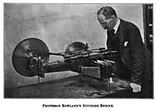 In 1882, before the Physical Society of London, Rowland gave a description of the diffraction gratings,[11][12] with which his name is specially associated,[lower-alpha 1] and which have been of enormous advantage to astronomical spectroscopy. These gratings consist of pieces of metal or glass ruled by means of a diamond point with a very large number of parallel lines, on the extreme accuracy of which their efficiency depends. For their production, therefore, dividing engines of extraordinary trueness and delicacy were required, and in the construction of such machines Rowland's engineering skill brought him conspicuous success. The results of his labors may be found in the elaborate Photographic Map of the Normal Solar Spectrum (1888) and the Table of Solar Wave-Lengths (1898).