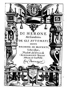 - On the main translations of the treatise, including Bernardino Baldi's 1589 translation into Italian, see now the discussion in Francesco Grillo (2019). Hero of Alexandria's Automata. A Critical Edition and Translation, Including a Commentary on Book One, PhD thesis, Univ. of Glasgow, pp. xxviii–xli.