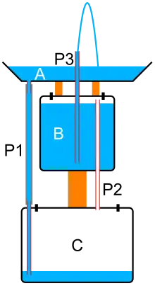 - P3 (in the middle of the picture) from the bottom of the water supply container (B), up through the bottom of the basin (A) to a height above the basin's rim. The fountain issues upwards through this pipe. The maximum height of P3 pipe depends on the height between B and C (see below).