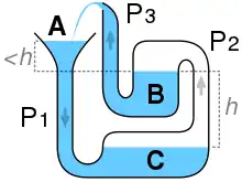 - Water moving up pipe P3 replaces water falling from A into C, closing the loop.