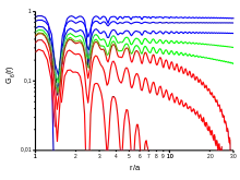 Again, the brackets denote the statistical average about all pairs of particles with distance . All three thermodynamic phases can be identified with this orientational correlation function: it does not decay in the 2D crystal but takes a constant value (shown in blue in the figure). The stiffness against local torsion is arbitrarily large, Franks's constant is infinity. In the hexatic phase, the correlation decays with a power law (algebraic). This gives straight lines in a log-log-plot, shown in green in the Figure. In the isotropic phase, the correlations decay exponentially fast, this are the red curved lines in the log-log-plot (in a lin-log-plot, it would be straight lines). The discrete structure of the atoms or particles superimposes the correlation function, given by the minima at half integral distances . Particles which are poorly correlated in position, are also poorly correlated in their director.