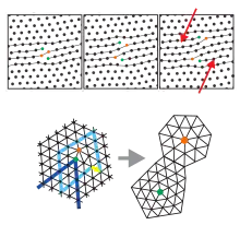 is a complex number of magnitude and the orientation of the six-folded director is given by the phase. In a hexagonal crystal, this is nothing else but the crystal-axes. The local director field disappears for a particle with five or seven nearest neighbours, as given by dislocations and disclinations , except a small contribution due to thermal motion. The orientational correlation function between two particles i and k at distance is now defined using the local director field: