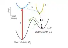 A hypothetical schematic diagram for the transition to an H state by photo excitation is shown in the Figure (After [4]). An absorbed photon causes an electron from the ground state G to an excited state E (red arrow). State E rapidly relaxes via Franck-Condon relaxation to an intermediate locally reordered state I. Through interactions with others of its kind, this state collectively orders to form a macroscopically ordered metastable state H, further lowering its energy as a result. The new state has a broken symmetry with respect to the G or E state, and may also involve further relaxation compared to the I state. The barrier EB prevents state H from reverting to the ground state G. If the barrier is sufficiently large compared to thermal energy kBT, where kB is the Boltzmann constant, the H state can be stable indefinitely.