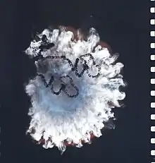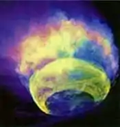 In general, nuclear effects in space (or very high altitudes) have a qualitatively different display. While an atmospheric nuclear explosion has a characteristic mushroom-shaped cloud, high-altitude and space explosions tend to manifest a spherical 'cloud,' reminiscent of other space-based explosions until distorted by Earth's magnetic field. The charged particles resulting from the blast are accelerated along the Earth's magnetic field lines to create an auroral display at the conjugate point,[2] which has led documentary maker Peter Kuran to characterize these detonations as 'the rainbow bombs'. The visual effects of a high-altitude or space-based explosion may last longer than atmospheric tests, sometimes in excess of 30 minutes. Heat from the Bluegill Triple Prime shot, at an altitude of 50 kilometers (31 miles), was felt by personnel on the ground at Johnston Atoll, and this test caused retina burns to two personnel at ground zero who were not wearing their safety goggles.
