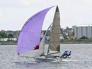 High-performance sailing is achieved with low forward surface resistance—encountered by catamarans, sailing hydrofoils, iceboats or land sailing craft—as the sailing craft obtains motive power with its sails or aerofoils at speeds that are often faster than the wind on both upwind and downwind points of sail. Faster-than-the-wind sailing means that the apparent wind angle experienced on the moving craft is always ahead of the sail.[1] This has generated a new concept of sailing, called "apparent wind sailing", which entails a new skill set for its practitioners, including tacking on downwind points of sail.[2]
