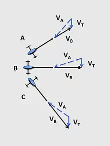 When drag angle of the hull is negligible, the formulas for calculating VA and β (the apparent wind angle) are:[27]