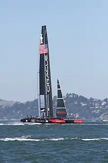 In 2013, a new class of catamaran was announced for the America's Cup which can achieve well in excess of double the speed of the wind.[5] The catamarans used for the 2013 America's Cup were expected to sail upwind at 1.2 times the speed of the true wind, and downwind at 1.6 times the speed of the true wind.[6][7][8] They proved to be faster, averaging about 1.8 times the speed of the wind with peaks slightly over 2.0.[9]