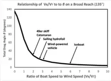 Given an ideal circumstance of a frictionless surface and an airfoil that can develop power, there is no theoretical limit to how fast a sailing craft can travel off the wind as the apparent wind angle becomes ever smaller. In reality, both sail efficiency and friction provide an upper limit. Speed is determined by the ratio of power developed by the sail over power lost through various forms of drag (e.g. surface drag and aerodynamic drag). Ideally a smaller sail is better, as speeds increase. Unfortunately, a small sail diminishes the ability for a craft—even an iceboat—to accelerate to speeds faster than the wind. The principal limit to speed in high-performance sailing craft is form drag. Efforts to overcome this limit is evident in the streamlined hulls of high-performance iceboats and the improvements in drag reduction on planing dinghies. A fast iceboat can achieve an apparent wind of 7.5° and a speed of six times the true wind speed on a course that is 135° off the wind. Bethwaite suggests this might be a practical limit for a craft powered by sails.[3]