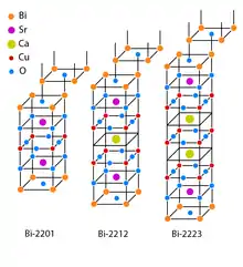 The second cuprate by practical importance is currently BSCCO, a compound of Bi–Sr–Ca–Cu–O. The content of bismuth and strontium creates some chemical issues. It has three superconducting phases forming a homologous series as Bi2Sr2Can−1CunO4+2n+x (n=1, 2 and 3). These three phases are Bi-2201, Bi-2212 and Bi-2223, having transition temperatures of 20 K (−253.2 °C), 85 K (−188.2 °C) and 110 K (−163 °C), respectively, where the numbering system represent number of atoms for Bi Sr, Ca and Cu respectively.[69] The two phases have a tetragonal structure which consists of two sheared crystallographic unit cells. The unit cell of these phases has double Bi–O planes which are stacked in a way that the Bi atom of one plane sits below the oxygen atom of the next consecutive plane. The Ca atom forms a layer within the interior of the CuO2 layers in both Bi-2212 and Bi-2223; there is no Ca layer in the Bi-2201 phase. The three phases differ with each other in the number of cuprate planes; Bi-2201, Bi-2212 and Bi-2223 phases have one, two and three CuO2 planes, respectively. The c axis lattice constants of these phases increases with the number of cuprate planes (see table below). The coordination of the Cu atom is different in the three phases. The Cu atom forms an octahedral coordination with respect to oxygen atoms in the 2201 phase, whereas in 2212, the Cu atom is surrounded by five oxygen atoms in a pyramidal arrangement. In the 2223 structure, Cu has two coordinations with respect to oxygen: one Cu atom is bonded with four oxygen atoms in square planar configuration and another Cu atom is coordinated with five oxygen atoms in a pyramidal arrangement.[70]