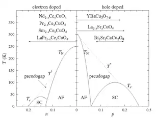 Phase diagram of cuprate superconductors: They can be basically split into electron (n) and hole (p) doped cuprates, as for the basic models describing semiconductors. Both standard cuprate superconductors, YBCO and BSCCO, are notably hole-doped.[36]