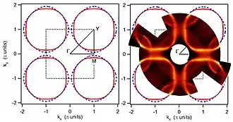 The electronic structure of superconducting cuprates is highly anisotropic (see the crystal structure of YBCO or BSCCO). Therefore, the Fermi surface of HTSC is very close to the Fermi surface of the doped CuO2 plane (or multi-planes, in case of multi-layer cuprates) and can be presented on the 2‑D reciprocal space (or momentum space) of the CuO2 lattice. The typical Fermi surface within the first CuO2 Brillouin zone is sketched in Fig. 1 (left). It can be derived from the band structure calculations or measured by angle resolved photoemission spectroscopy (ARPES). Fig. 1 (right) shows the Fermi surface of BSCCO measured by ARPES. In a wide range of charge carrier concentration (doping level), in which the hole-doped HTSC are superconducting, the Fermi surface is hole-like (i.e. open, as shown in Fig. 1). This results in an inherent in-plane anisotropy of the electronic properties of HTSC. In 2018, the full three dimensional Fermi surface structure was derived from soft x-ray ARPES.[37]