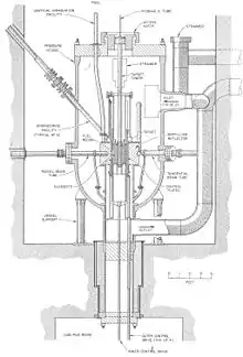 The reactor core assembly is in an 8-ft (2.44-m)-diameter pressure vessel in a pool of water. The top of the pressure vessel is 17 ft (5.2 m) below the pool surface. The control plate drive mechanisms are in a sub-pile room beneath the pressure vessel. These features give the necessary shielding for working above the reactor core and greatly facilitate access to the pressure vessel, core, and reflector regions.