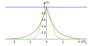 This model fits the observation that was done by Hanbury Brown and Twiss using stellar light as demonstrated in figure 3. If thermal light was used instead of stellar light in the same setup, then we would see a different function for the second order coherence.[10] Thermal light can be modeled to be a Lorentzian power spectrum centered around frequency , which means , where is the coherence length of the beam. Correspondingly, and . The second-order coherence for stellar (Gaussian), thermal (Lorentzian) and coherent light is shown in Figure 4. Note that when stellar/thermal light beam is first order coherent i.e. , the second order coherence is 2, meaning at zero time delay chaotic light right is first order coherent but not second order coherent.[2][10]