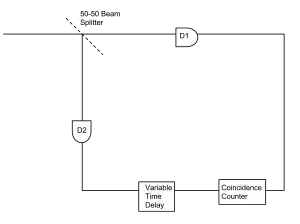 In the Hanbury Brown and Twiss experiment (Figure 2.), a light beam is split using a beam splitter and then detected by detectors, which are equidistant from the beam splitter. Subsequently, signal measured by the second detector is delayed by time and the coincidence rate between the original and delayed signal is counted. This experiment correlates intensities, , rather than electric fields and hence measures the second order correlation function