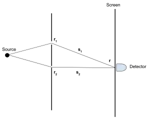 The intensity fluctuates as a function of position i.e. the quantum mechanical treatment also predicts interference fringes. Moreover, in accordance to the intuitive understanding of coherence i.e. ability to interfere, the interference patterns depend on the first-order correlation function .[3] Comparing this to the classical intensity, we note that the only difference is that the classical normalized correlation is now replaced by the quantum correlation . Even the computations here look strikingly similar to the ones that might be done classically.[4] However, the quantum interference that occurs in this process is fundamentally different from the classical interference of electromagnetic waves. Quantum interference occurs when two possible histories, given a particular initial and final state, interfere. In this experiment, given an initial state of the photon before the pinhole and it final state at the screen, the two possible histories correspond to the two pinholes through which the photon could have passed. Hence, quantum mechanically, here the photon is interfering with itself. Such interference of different histories, however, occurs only when the observer has no specific way of determining which of the different histories actually occurred. If the system is observed to determine the path of the photon, then on average the interference of amplitudes will vanish.[3]