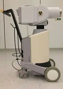 Eastman Kodak filed the first patent for digital radiography in 1973.[58] The first commercial CR (Computed Radiology) solution was offered by Fujifilm in Japan in 1983 under the device name CR-101.[59] X-ray imaging plates are used in X-ray diagnostics to record the shadow image of X-rays. The first commercial digital X-ray system for use in dentistry was introduced in 1986 by Trophy Radiology (France) under the name Radiovisiography.[60] Digital x-ray systems help reduce radiation exposure. Instead of film, the machines contain a scintillator that converts the incident X-ray photons either into visible light or directly into electrical impulses.