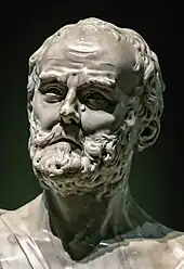 Epicurus (c. 341–270 BCE) viewed weight as an inherent property of atoms which influences their movement.[14] These atoms move downward in constant free fall within an infinite vacuum without resistance at equal speed, regardless of their mass. On the other hand, upward motion is due to atomic collisions.[15] Epicureans deviated from older atomist theories like Democritus' (c. 460–c. 370 BCE) by proposing the idea that atoms may randomly deviate from their expected course.[16]
