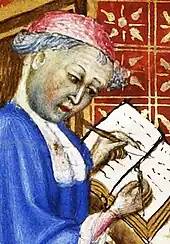 In the 14th century, both the French philosopher Jean Buridan and the Oxford Calculators (the Merton School) of the Merton College of Oxford rejected the Aristotelian concept of gravity.[51][lower-alpha 3] They attributed the motion of objects to an impetus (akin to momentum), which varies according to velocity and mass;[51] Buridan was influenced in this by Ibn Sina's Book of Healing.[1] Buridan and the philosopher Albert of Saxony (c. 1320–1390) adopted Abu'l-Barakat's theory that the acceleration of a falling body is a result of its increasing impetus.[2] Influenced by Buridan, Albert developed a law of proportion regarding the relationship between the speed of an object in free fall and the time elapsed.[52] He also theorized that mountains and valleys are caused by erosion[lower-alpha 4]—displacing the Earth's centre of gravity.[53][lower-alpha 5]