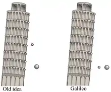 Between 1589 and 1592,[69] the Italian scientist Galileo Galilei (then professor of mathematics at the University of Pisa) is said to have dropped "unequal weights of the same material" from the Leaning Tower of Pisa to demonstrate that their time of descent was independent of their mass, according to a biography by Galileo's pupil Vincenzo Viviani, composed in 1654 and published in 1717.[70][71]: 19–21 [72][73] The basic premise had already been demonstrated by Italian experimenters a few decades earlier.