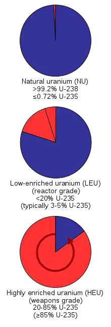 Uranium appears in nature primarily in two isotopes: uranium-238 and uranium-235. When the nucleus of uranium-235 absorbs a neutron, it undergoes nuclear fission, releasing energy and, on average, 2.5 neutrons. Because uranium-235 releases more neutrons than it absorbs, it can support a chain reaction and so is described as fissile. Uranium-238, on the other hand, is not fissile as it does not normally undergo fission when it absorbs a neutron.