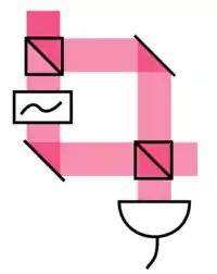 In optical interferometry, homodyne signifies that the reference radiation (i.e. the local oscillator) is derived from the same source as the signal before the modulating process. For example, in a laser scattering measurement, the laser beam is split into two parts. One is the local oscillator and the other is sent to the system to be probed. The scattered light is then mixed with the local oscillator on the detector. This arrangement has the advantage of being insensitive to fluctuations in the frequency of the laser. Usually the scattered beam will be weak, in which case the (nearly) steady component of the detector output is a good measure of the instantaneous local oscillator intensity and therefore can be used to compensate for any fluctuations in the intensity of the laser.[1][2]