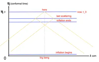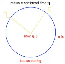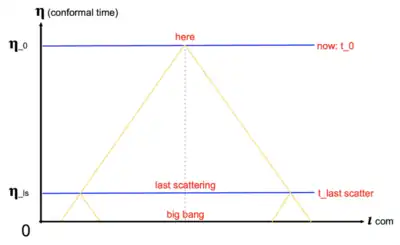 Note we use conformal time in the following diagrams. Conformal time describes the amount of time it would take a photon to travel from the location of the observer to the farthest observable distance (if the universe stopped expanding right now).